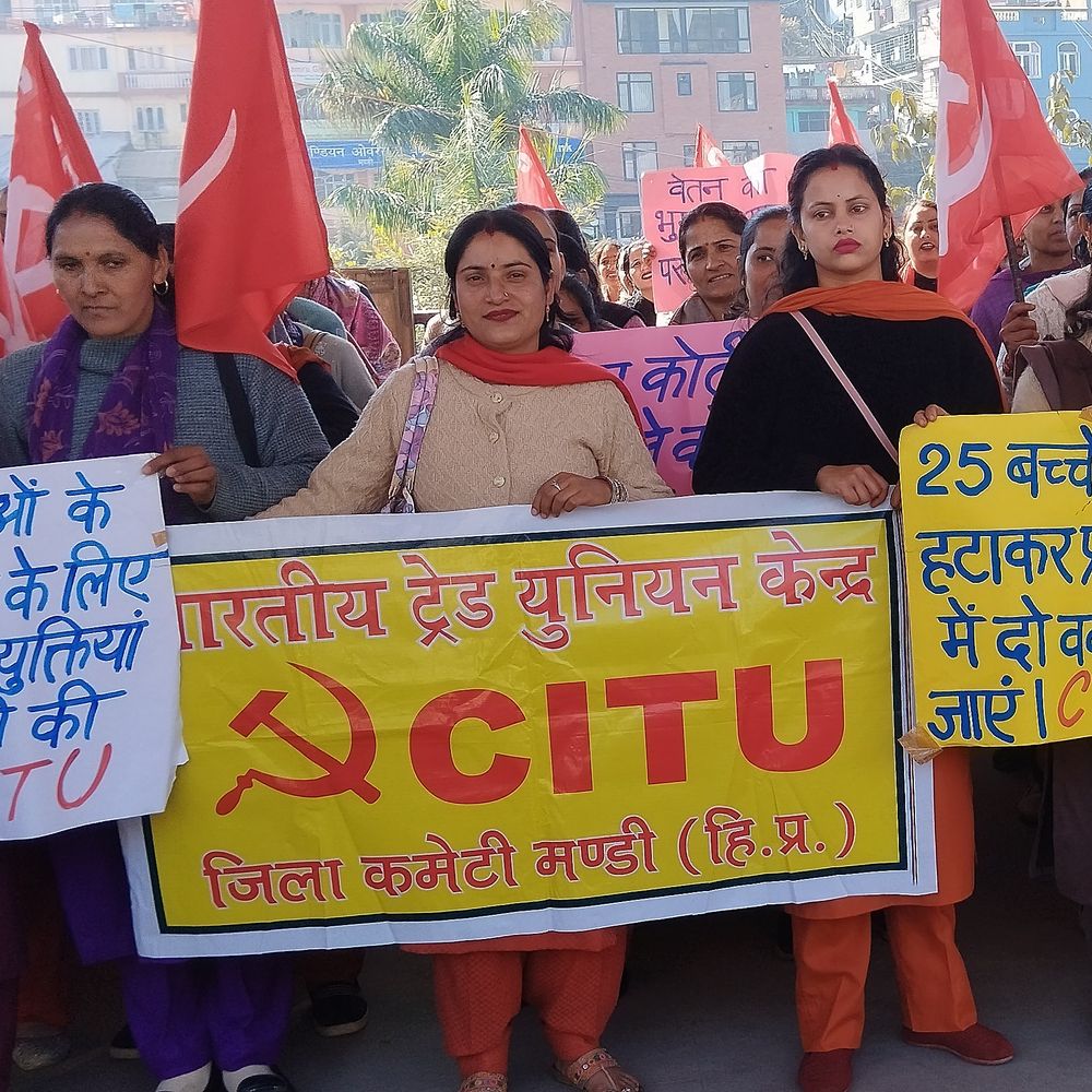 मंडी में बुधवार को आंगनबाड़ी वर्कर, सहायिकाओं और मिड-डे मील कर्मियों ने प्रदेश सरकार के खिलाफ जोरदार प्रदर्शन किया। जिले के विभिन्न खंडों से सैकड़ों स्कीम वर्कर अपनी मांगों को लेकर इस विरोध प्रदर्शन में शामिल हुए। प्रदर्शनकारियों ने आरोप लगाया कि, केंद्र सरकार ने 2009 से मिड-डे मील कर्मियों और 2020 से आंगनबाड़ी वर्करों के मानदेय में कोई वृद्धि नहीं की है। उनके बजट में हर साल कटौती की जा रही है और कई महीनों तक वेतन का भुगतान नहीं किया जाता, जिससे उनमें भारी रोष है। आंगनबाड़ी वर्कर्स की प्रमुख मांग आंगनबाड़ी वर्कर हेल्पर यूनियन की प्रधान विमला शर्मा ने कहा कि एक तरफ सरकार अपने कार्यक्रमों का जश्न मना रही है, वहीं उनकी मांगों पर ध्यान नहीं दिया जा रहा। वर्करों ने सुप्रीम कोर्ट के आदेश के अनुसार आंगनबाड़ी कर्मियों को ग्रेच्युटी, पेंशन, चिकित्सा और मातृत्व अवकाश जैसी सुविधाएं देने की मांग की। उन्होंने मिड-डे मील वर्करों के लिए भी आंगनबाड़ी कर्मियों की तर्ज पर 20 आकस्मिक अवकाश देने का प्रावधान करने की अपील की। हर महीने की पहली तारीख को वेतन भुगतान की मांग उन्होंने मांग की कि, मिड-डे मील कर्मियों का मानदेय हर महीने की पहली तारीख को उनके बैंक खाते में एकमुश्त जमा किया जाए। इसके अतिरिक्त, 45वें भारतीय श्रम सम्मेलन की सिफारिशों को लागू करते हुए आंगनबाड़ी और मिड-डे मील कर्मियों को श्रमिक/कर्मचारी का दर्जा देने, केंद्र सरकार द्वारा निर्धारित न्यूनतम वेतन और महंगाई भत्ता तत्काल लागू करने की मांग की गई। उन्होंने मिड-डे मील कर्मियों को 10 महीने के बजाय 12 महीने का वेतन देने और योजना को आठवीं कक्षा से बढ़ाकर 12वीं तक करने की भी वकालत की। प्रदर्शनकारियों ने वेदांत, नंद घर, पिरामल और आईएसए जैसी संस्थाओं के नाम पर आंगनबाड़ी और मिड-डे मील योजनाओं के निजीकरण पर तत्काल रोक लगाने की मांग की। उन्होंने मजदूर विरोधी चार श्रम संहिताओं को रद्द कर पुरानी श्रम कानून व्यवस्था बहाल करने की भी अपील की। प्रदर्शन के बाद, इन कर्मियों ने प्रधानमंत्री को संबोधित एक ज्ञापन भी प्रेषित किया।