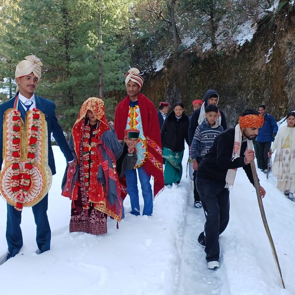 हिमाचल प्रदेश में मंडी जिले की सराज विधानसभा क्षेत्र में भारी बर्फबारी के बावजूद एक युवक और युवती का विवाह संपन्न हुआ। खास बात यह है कि दूल्हा तीन से चार फुट जमी बर्फ पर पैदल ही अपनी दुल्हन को लेकर आया। दुल्हन को बर्फ की मोटी चादर के बीच तीन से चार घंटे पैदल चलकर ससुराल पहुंचाया गया। शुक्रवार सुबह छह बजे से शुरू हुई बारिश और बर्फबारी देर रात तक जारी रही। जंजैहली, बगस्याड़, लंबाथाच कल्हणी, लंबाथाच शैट्टाधार, थुनाग और सराची सहित पूरे सराज क्षेत्र में भारी हिमपात दर्ज किया गया। इस बर्फबारी से कुछ इलाकों में सड़कें बंद हो गईं और आवागमन प्रभावित हुआ। यह घटना सराज विधानसभा क्षेत्र की केओली पंचायत की है। भारी हिमपात के कारण सड़कें और रास्ते बंद होने के बावजूद बुनालीघार निवासी दूल्हा गितेश ठाकुर, अपनी दुल्हन ऊषा ठाकुर को लाने के लिए दृढ़ रहा। वह सीमित बारातियों के साथ लगभग सात किलोमीटर बर्फीले और दुर्गम रास्तों को पैदल तय कर भैचड़ी पहुंचा। भैचड़ी में तीन से चार फीट बर्फ के बीच विवाह की सभी रस्में पूरी की गईं। बारात बुनालीधार से कमीशरधार और थनुटा होते हुए भैचड़ी पहुंची थी। रातभर विवाह की रस्में निभाई गईं और सुबह सवा सात बजे दुल्हन की विदाई हुई। दुल्हन और बारातियों ने दो घंटे की खड़ी चढ़ाई और लगभग चार घंटे का पैदल सफर तय किया। तीन फुट बर्फीले रास्तों से होते हुए वे सुबह करीब 11 बजे घर पहुंचे। भारी बर्फबारी के कारण पगडंडियां भी बर्फ से ढकी थीं, जिससे पालकी का उपयोग संभव नहीं था। इसलिए दुल्हन को बिना पालकी के ही लाया गया। देखिए फोटो….