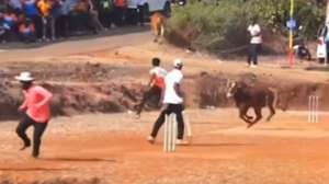 क्रिकेट खेल रहे खिलाड़ियों को अचानक वहां से भागना पड़ा क्योंकि एक गुस्सैल सांड वहां पर पहुंच गया और पिच पर दौड़ने लगा। इसका वीडियो काफी वायरल हो रहा है।