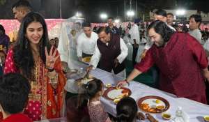 अंबानी परिवार में शादी की रस्मों की शुरुआत आज बुधवार को अन्न सेवा के साथ हुई है। इस दौरान परिवार के प्रमुख मुकेश अंबानी और दूल्हा-दुल्हन ने लोगों को अपने हाथों से खाना परोसा है।