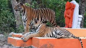 सोशल मीडिया पर इस वक्त बाघ के एक जोड़े का वीडियो काफी वायरल हो रहा है। वायरल वीडियो में बाघ का जोड़ा हनुमान जी के एक मंदिर के पास बैठा नजर आ रहा है।