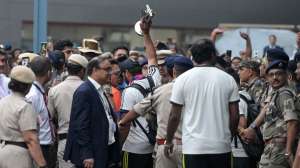 टी20 वर्ल्ड कप 2024 की ट्रॉफी को जीतने के बाद भारतीय क्रिकेट टीम स्पेशल फ्लाइट से 4 जुलाई की सुबह दिल्ली एयरपोर्ट पहुंच गई है। टीम इंडिया के कप्तान रोहित शर्मा ने एयरपोर्ट से बाहर निकलते हुए ट्रॉफी को अपने हाथ में लिए हुए थे, जिसे उन्होंने फैंस को भी दिखाया।