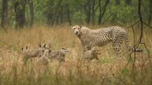 मध्य प्रदेश के कूनो नेशनल पार्क में सितंबर 2022 में दक्षिण अफ्रीकी राज्य नमीबिया से चीता लाए गए थे। गामिनी नाम की मादा चीता बारिश के बीच अपने शावकों संग मौज-मस्ती करते हुए दिखी है।