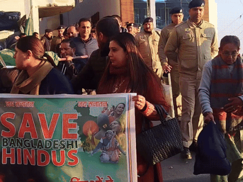 हिमाचल प्रदेश की राजधानी शिमला में बांग्लादेश के खिलाफ हिंदू संगठनों ने प्रदर्शन किया। साथ ही बांग्लादेश के सरकार की शव यात्रा निकाल कर वहां हिंदुओं पर हो रहे अत्याचार का विरोध किया। बांग्लादेश में इस्कॉन मंदिर के संत चिन्मय कृष्ण दास की गिरफ्तारी और हिंदू समाज पर हो रहे अत्याचारों के विरोध में शनिवार को हिमाचल प्रदेश की राजधानी शिमला के संजौली में हिंदू संगठनों के कार्यकर्ताओं ने बांग्लादेश सरकार की शव यात्रा निकाली। प्रदर्शनकारियों ने जय श्रीराम और भारत माता जिंदाबाद के नारे लगाते हुए बांग्लादेश सरकार के खिलाफ नारेबाजी की और हिंदुओं पर हो रहे हमलों की कड़े शब्दों में निंदा की। हिंदू संगठनों के कार्यकर्ताओं ने अंतर्राष्ट्रीय संस्थाओं से मामले में हस्तक्षेप की मांग करते हुए बांग्लादेश सरकार के खिलाफ कार्रवाई की मांग की। हिंदू संगठनों के कार्यकर्ताओं ने शिमला के संजौली में ढली टनल से लेकर संजौली चौक तक बांग्लादेश सरकार की शव यात्रा निकाली। प्रदर्शनकारियों ने बांग्लादेश सरकार के खिलाफ नारेबाजी की और सनातन धर्म जिंदाबाद, और जय श्रीराम के नारे लगाए और अंत मे संजौली चौक पर बांग्लादेश सरकार की शव यात्रा को जलाया। इस दौरान संजौली में कानून व्यवस्था को बनाए रखने के मद्देनजर भारी पुलिस बल व QRT के जवानों को भी तैनात किया गया था। प्रदर्शनकारी विजय शर्मा ने बताया कि बांग्लादेश में बीते कई दिनों से पूरे विश्व को शर्मसार करने वाला घटनाक्रम घट रहा है। उन्होंने कहा कि बांग्लादेश में हिंदुओं पर जिस तरीके से अत्याचार हो रहा ,है वो असहनीय है। उन्होंने कहा कि हिन्दू समाज UNO जैसी अंतरराष्ट्रीय संस्थाओं से मामले में हस्तक्षेप करने और वहां की सरकार के खिलाफ कार्रवाई करने की मांग की। विजय शर्मा ने कहा कि हिन्दू संगठनों ने बांग्लादेश में हो रहे अत्याचारों के खिलाफ शिमला के संजौली में शव यात्रा निकाली है।