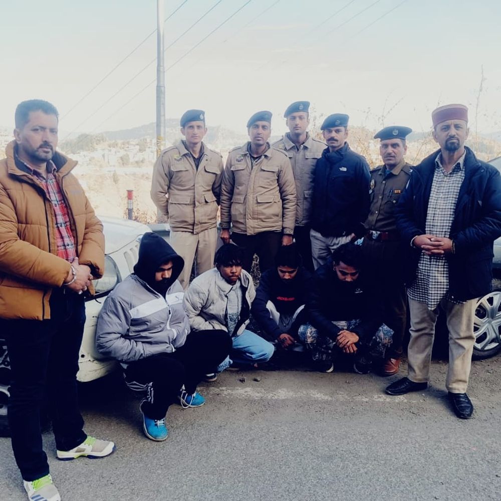 शिमला में नए साल का जश्न मनाने हजारों की संख्या में सैलानी पहुंच रहे हैं। इसी बीच पंजाब के चार चिट्टा तस्कर चिट्टे को बेचने शिमला पहुंचे थे। शिमला पुलिस ने इन्हें चिट्टे के साथ रंगे हाथ गिरफ्तार किया है। इनके पास से 41.7 ग्राम चिट्टा बरामद किया गया है। पुलिस ने आरोपियों के खिलाफ एनडीपीएस एक्ट के तहत केस दर्ज कर आगामी कार्रवाई शुरू कर दी है। पुलिस से प्राप्त जानकारी के अनुसार ठियोग के नंगलदेवी में ठियोग थाना की टीम गश्त पर थी। इस दौरान पुलिस को नंगल देवी में पंजाब नंबर की एक गाड़ी पीबी 13 एएन 0053 मिली। पुलिस ने शक के आधार पर इसकी जांच की। जांच के दौरान पुलिस ने कार में सवार चार युवकों के पास से 41.7 ग्राम चिट्टा बरामद किया गया। पंजाब के रहने वाले हैं तस्कर