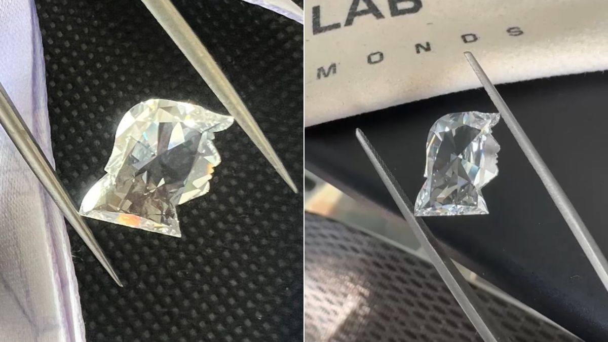 सूरत के लैबग्रोन डायमंड पर अमेरिका के 47वें राष्ट्रपति डोनाल्ड ट्रंप की तस्वीर उकेरी गई है। डोनाल्ड ट्रंप के चेहरे को साइड से देखने पर जैसी आकृति बनती है उसी शेप में इस हीरे को तराशा गया है। यह खास हीरा ट्रंप को तोहफे में दिया जाएगा।