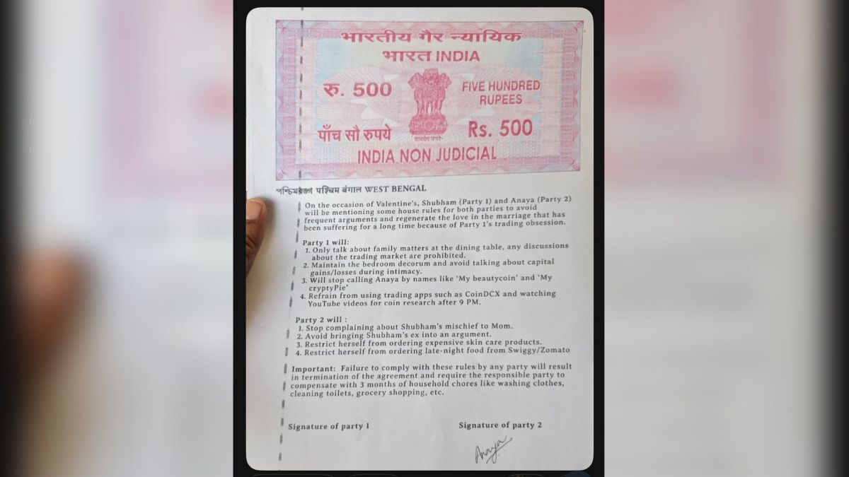 एक गजब का कॉन्ट्रैक्ट सोशल मीडिया पर देखने को मिला जिसे देखने के आप भी हैरत में पड़ जाएंगे। एक महिला ने अपने पति के सामने एक कॉन्ट्रैक्ट पेश किया जिसमें दोनों के लिए कुछ अलग-अलग नियम और उसे तोड़ने पर सजा तय की गई है।