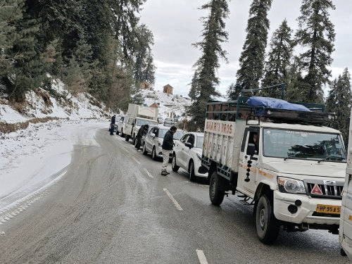 हिमाचल प्रदेश में मौसम ने एक बार फिर करवट बदली है। शिमला जिले की ऊंची चोटियों पर फिर से बर्फबारी शुरू हो गई है। निचले इलाकों में बारिश हो रही है। नारकंडा में भारी बर्फबारी के कारण राष्ट्रीय राजमार्ग-5 पर यातायात पूरी तरह से रुक गया है। सड़क पर जमी बर्फ की वजह से फिसलन बढ़ गई है। इस कारण वाहन आगे नहीं बढ़ पा रहे हैं। रिकांग पिओ डिपो की 3 बसें नारकंडा में फंस गई हैं। परिवहन विभाग ने यात्रियों की सुविधा को देखते हुए शिमला जाने वाली बसों का रूट बदल दिया है। अब बसें सुन्नी और बसंतपुर होकर शिमला पहुंच रही हैं। रामपुर-रोहडू मार्ग भी सुंगरी के पास बंद हो गया है। दुर्गम क्षेत्रों में भी बस सेवाएं प्रभावित हो रही हैं। स्नो बाउंड एरिया में बसें खड़ी न करने की हिदायत रामपुर परिवहन डिपो प्रबंधन ने बस चालकों को विशेष निर्देश जारी किए हैं। ड्राइवरों को स्नो बाउंड एरिया में बसें न खड़ी करने की हिदायत दी गई है। ऊंचाई वाले रूटों पर जाने वाली बसों को रात में ही वापस आने के निर्देश दिए गए हैं। बर्फबारी किसानों और बागवानी के लिए फायदेमंद साबित हो रही है। हालांकि आम जनजीवन प्रभावित हो रहा है। मौसम और खराब होने पर ग्रामीण क्षेत्रों में लोगों की परेशानियां बढ़ सकती हैं। पीडब्ल्यूडी विभाग ने नेशनल हाईवे -5 को खोलने के लिए काम शुरू कर दिया है। मजदूर सड़क पर रेत डाल रहे हैं ताकि फिसलन को कम किया जा सके। मौसम विभाग के अनुसार, मौसम साफ होते ही बंद सड़कों को बहाल कर दिया जाएगा।