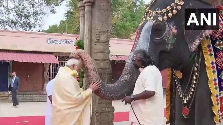 पीएम मोदी ने तमिलनाडु के तिरुचिरापल्ली में श्री रंगनाथस्वामी मंदिर के दर्शन किए हैं। इस दौरान उन्होंने एक हाथी का भी आशीर्वाद लिया, जिसकी तस्वीर सामने आई है। इस तस्वीर में हाथी, पीएम मोदी के सिर पर अपनी सूंढ़ रखकर आशीर्वाद दे रहा है।