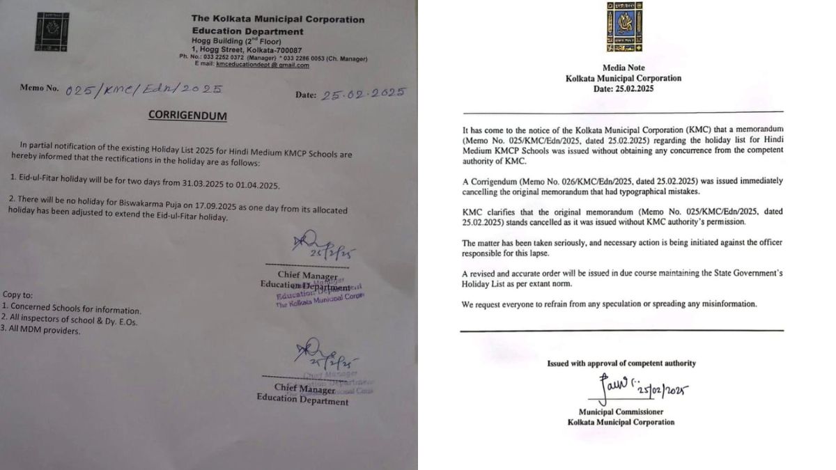 कोलकाता नगर निगम की एक नोटिस पर विवाद हो रहा है, जिसमें विश्वकर्मा पूजा की छुट्टी रद्द कर ईद पर 2 दिन की छुट्टी देने की बात कही गई थी। बाद में इसे जारी करने वाले अधिकारी को ‘कारण बताओ’ नोटिस जारी किया गया।